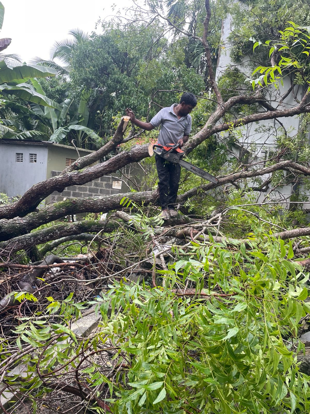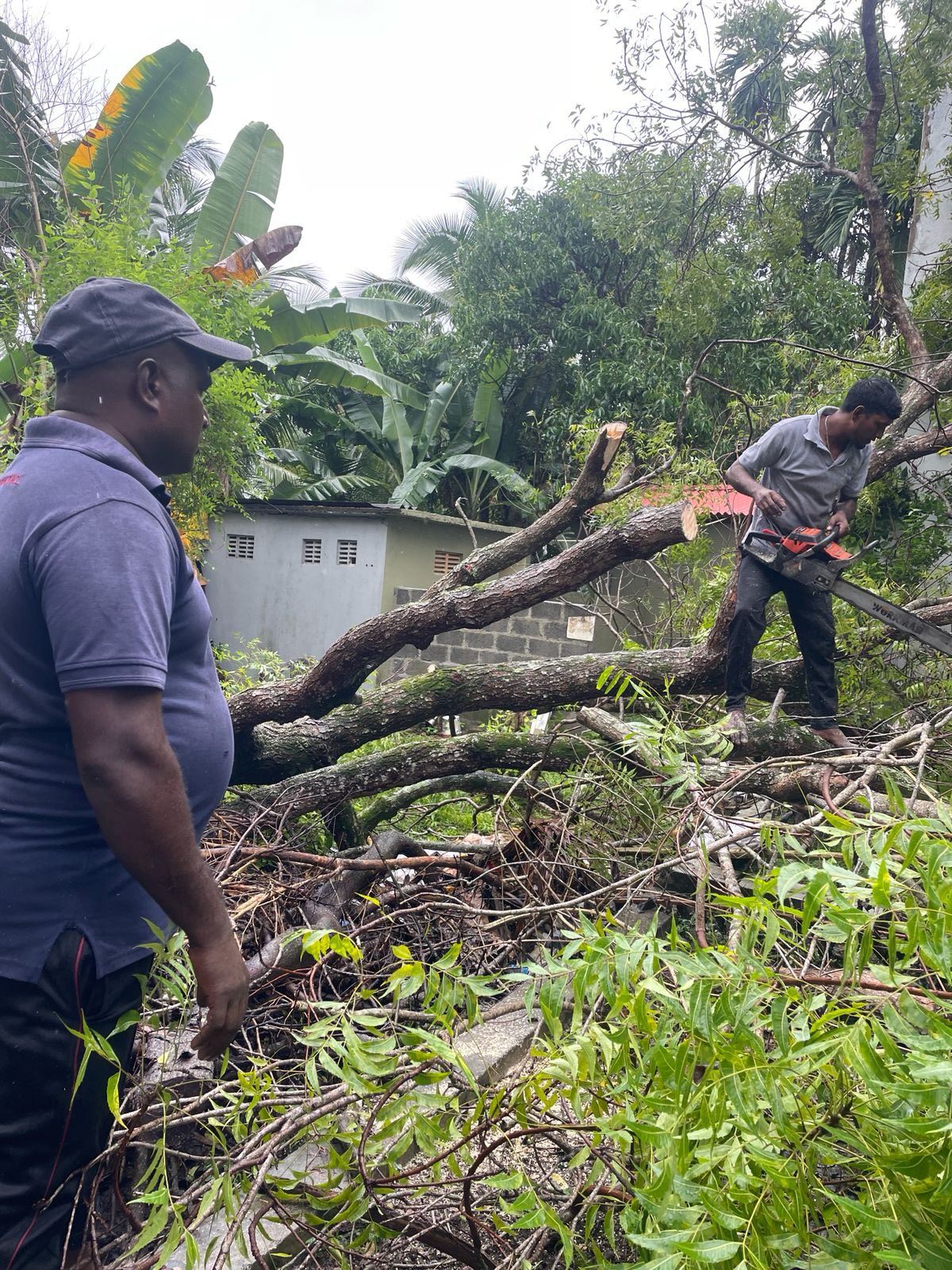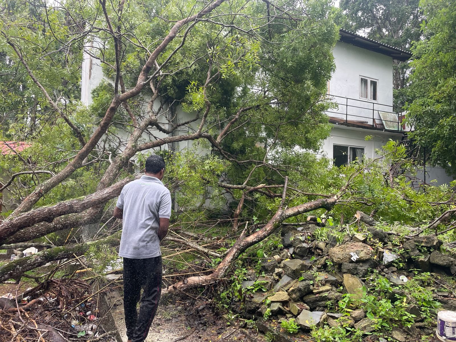 දිට්වා සුලි කුණාටුව හේතුවෙන් මාකන්දන බටහිර ග්රාම සේවා වසමේ ධම්සිසිල විහාරස්ථානයේ කොහඹ ගසක් කඩා වැටීම.